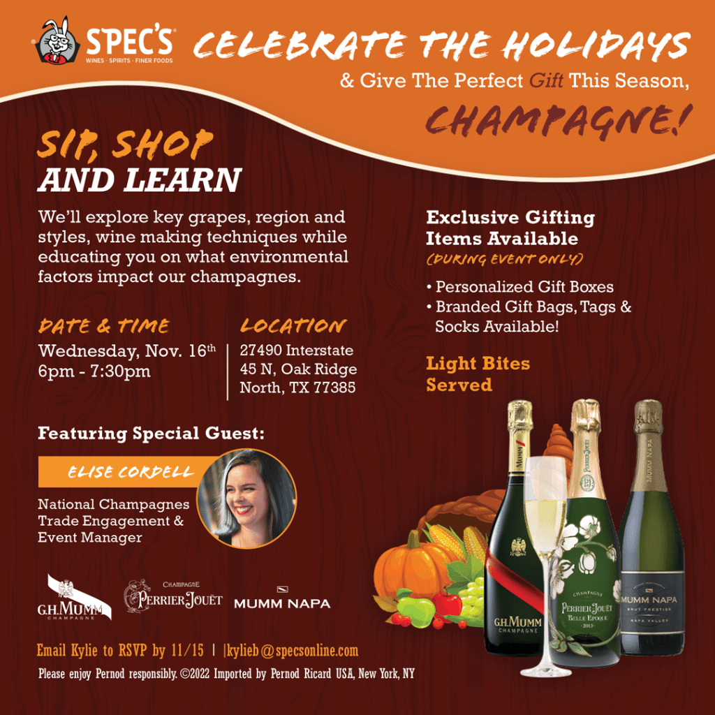 CHAMPAGNE TASTING AT SPEC’S OAK RIDGE TOMORROW, NOVEMBER 16TH FROM 6-7:30pm