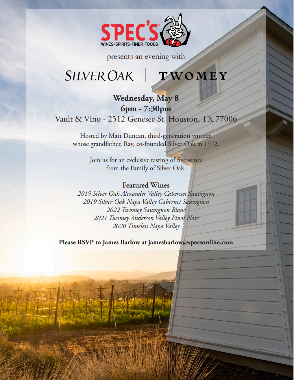 I am pleased to announce that I will have 3rd generation vintner of Silver Oak Winery, Matt Duncan, in town on Wednesday, May 8th from 6:30-8:00PM to host a tasting for us! This will be a rare treat as it is not often we have a family member of one of the premier wineries in all of Napa to walk us through the winery’s wines. I have really become a fan of this winery of the years because of their standards of excellence and ardent necessity to farm in a more earth friendly environment. This will be quite a special evening where he will show off the wines of Silver Oak and their sister property Twomey…and maybe open a special bottle to boot. This tasting will be limited to 50 people, so please RSVP quickly! SEE YOU THERE! Small bites will be available at the event.
